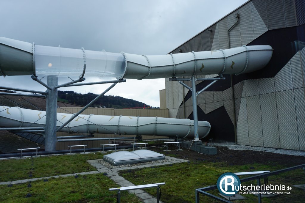 Bereits während unseres Besuches 2014 im Freizeit- und Erlebnisbad Säntispark Abtwil in der Schweiz war klar, dass die Anlage innerhalb der nächsten Jahre eine Erweiterung erhalten wird. Das Spaßbad im Südosten des Schweizer Kantons St. Gallen gehört zum Großunternehmen Migros, das am selben Standort weitere Freizeitmöglichkeiten und ein Einkaufszentrum betreibt. Wo man früher auf dem Weg zur Schwimmbad-Kasse bereits einen Blick auf die Wildwasserrutsche werfen konnte, fällt jetzt der Blick nach Rechts in den neuen und futuristisch anmutenden Rutschenbereich “Der Berg”. Hier kriegt man sofort Lust auf eine Rutschpartie, also auf zur Kasse und rein ins Vergnügen!