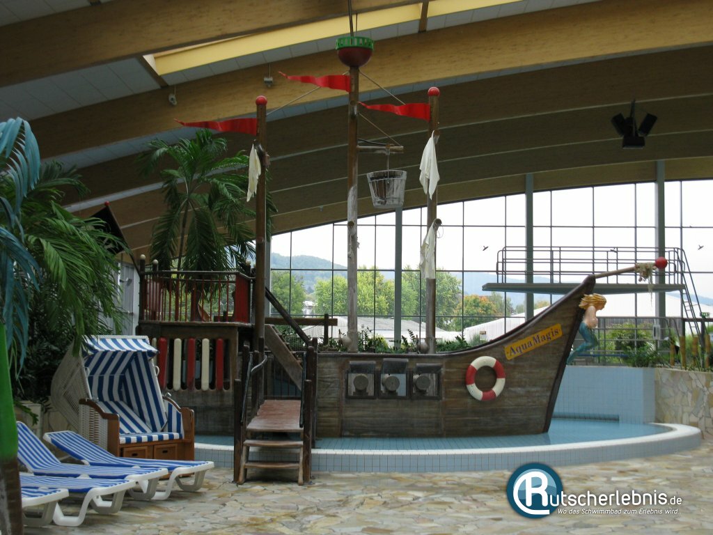 Der Sportbereich in der großen und lichtdurchfluteten Schwimmhalle ist dezent durch den Gastronomiebereich und durch die Kinderlandschaft vom Rest des Erlebnisbades abgetrennt, sodass Schwimmer hier relativ ungestört ihre Bahnen ziehen können. Der angesprochene Kinderbereich ist sehr freundlich und umfangreich gestaltet. So gibt es eine Lagune mit Piratenschiff und einer Wasserrutsche für Kinder. Direkt daneben schließt sich ein Dschungel-Wasserhaus an, von welchem eine Rutsche aus in das flache Babybecken führt. Zusätzlich gibt es weitere Wasserspielzeuge und eine wasserspeiende Schlange. Alles ist extra bunt und ringsherum gibt es ausreichend Sitz- und Liegemöglichkeiten für die Eltern der kleinen Sprösslinge.