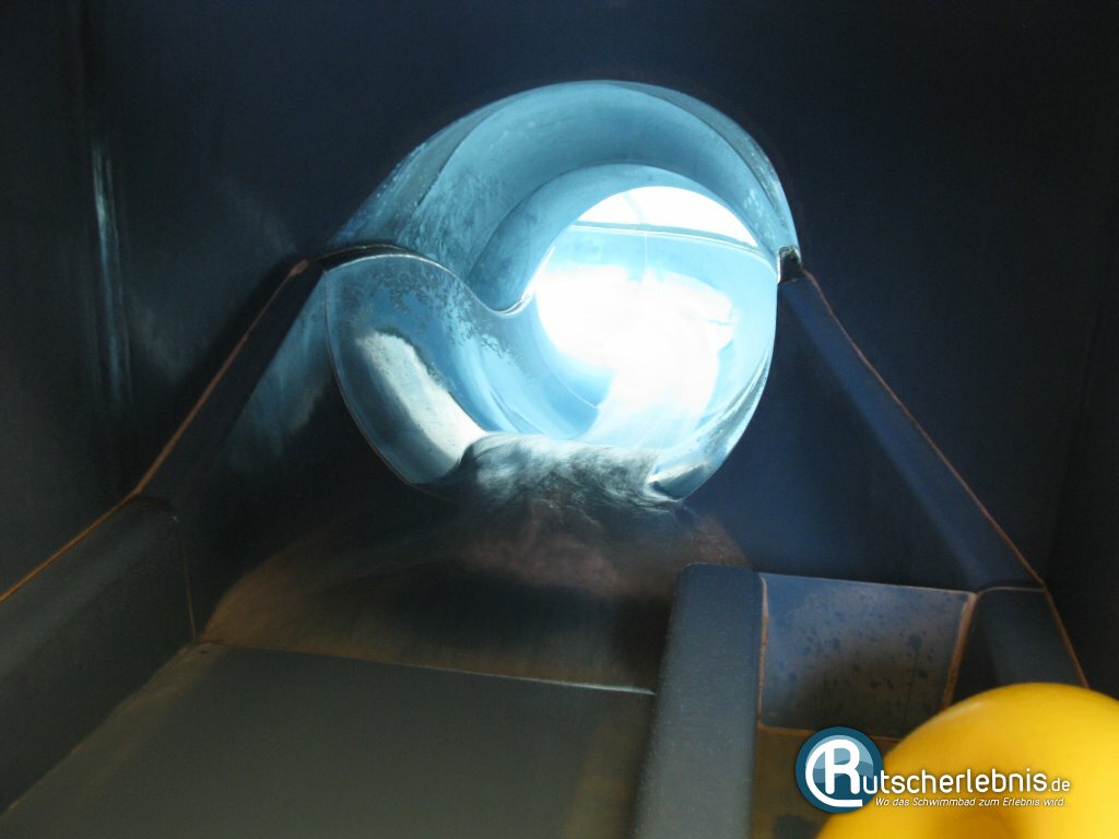 Zum Ende hin gibt es dann noch eine Überraschung in Form eines komplett dunklen Bereiches ohne jede Beleuchtung, wo man zuerst in einer scharfen Kurve durchgeschleudert wird um dann mit einem heftigen Jump Richtung Rutschauslauf katapultiert zu werden! Wenn man diese Rutsche das erste mal rutscht und nicht auf diese Stelle vorbereitet ist, sind blaue Flecken an den Ellbogen garantiert. Nichtsdestotrotz macht die Rutsche riesigen Spaß und geht flott zur Sache.