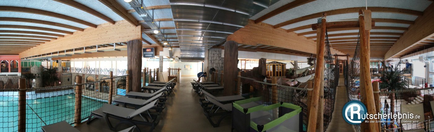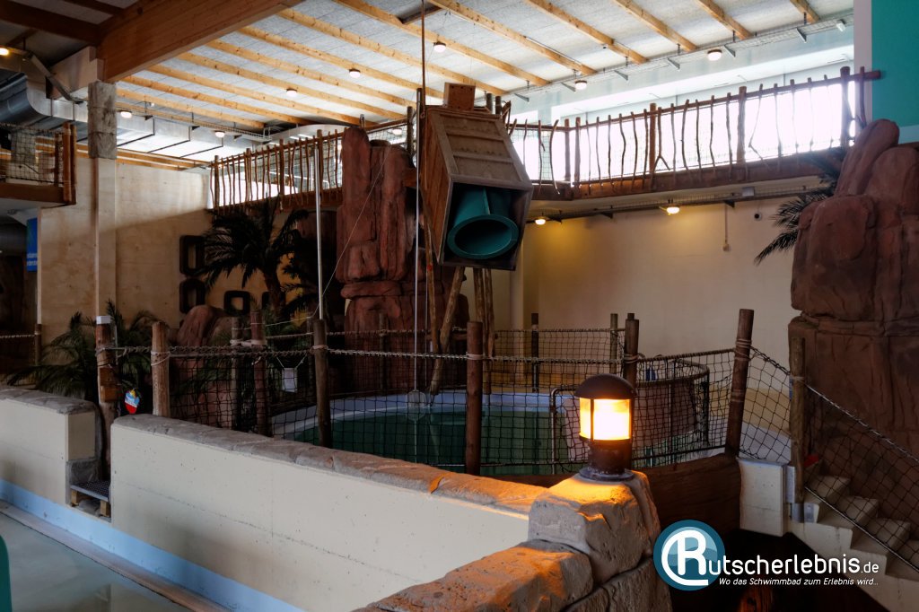 Im Innenbereich gibt es weitere Wasserangebote für kleine Freibeuter. Die Piratenbucht ist eine große Kinder-Wasserwelt mit Piratenschiff, Wasserkanonen, mehrere Kinderrutschen und wasserspeienden Figuren. Überall spritzt es aus kleinen Düsen, im Boden eingelassene Sprudler blubbern vor sich hin. Über eine lange Hängebrücke kann man sich den Kinderbereich zudem aus der Höhe anschauen – ordentlich Geschaukel inklusive.