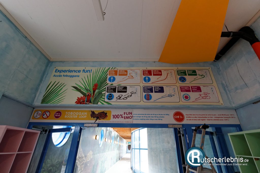 Nun geht es zum großen Rutschenturm im Aquaparc Le Bouveret, von dem die verbleibenden sieben Riesenrutschen starten. Wir gehen von unten nach oben und legen mit der aus 14 Metern Höhe startenden Toboggan bleu los. Diese blaue Reifenrutsche wird ausschließlich mit Dreier-Booten gerutscht, bei denen man hintereinander sitzt. Wie in einer Bobbahn rast man so durch die blaue Röhre. In den Kurven wirken bei voller Besetzung ordentliche G-Kräfte und man wird in die Seite gedrückt. Man darf aber auch alleine oder zu zweit rutschen.