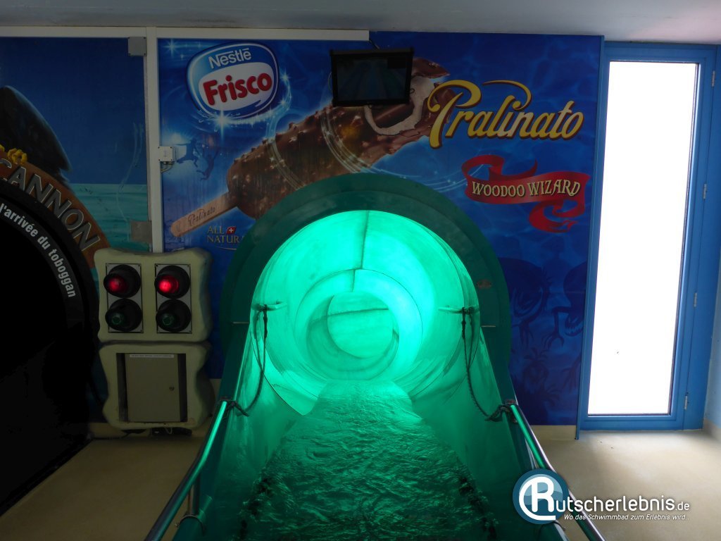 Ein Stockwerk höher starten zwei weitere Rutschen aus 17 Metern Höhe. Die Woodoo Wizard ist eine grüne Reifenrutsche mit transluzenter Röhre und einem coolen Ende. Die Rutsche darf ausschließlich mit Einzelreifen genutzt werden. Nach einer rasanten Rutschpartie durch die Röhre geht es am Ende – ähnlich wie bei der blauen Reifenrutsche – ein Steilstück nach unten, ehe man im Flachwasserauslauf abgebremst wird. Die Röhrenrutsche ist 125 Meter lang.