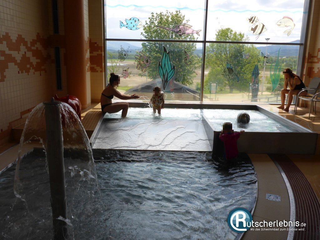 Schließlich gibt es auch ein Kinderbecken. Das in einem separaten Raum untergebrachte Planschbecken verfügt über zwei Becken-Ebenen mit zahlreichen Wasser-Attraktionen. Ein Wasserigel, ein Wasserschleier und ein wasserspeiendes Nashorn sorgen für Unterhaltung bei Pampersrockern. Die beiden Edelstahl-Pools sind über eine Mini-Breitrutsche miteinander verbunden. Wie es sich für einen Eltern-Kind-Bereich gehört gibt es angrenzend einen Wickelraum und natürlich Sitz- und Liegemöglichkeiten rund um das Kinderbecken.