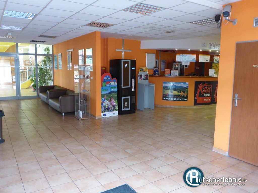 Nach dem morgendlichen Freibad-Abenteuer geht es jetzt ins Erlebnisbad des Aquapark Olešná Frýdek-Místek. Der Eingang befindet sich direkt gegenüber vom Freibad. Das Foyer ist nett gestaltet und beherbergt neben der Kasse auch ein kleines Café und einen Bademoden-Shop. An der Kasse wird man herzlich begrüßt, auch wenn man der tschechischen Sprache nicht mächtig ist klappt die Verständigung mit ein paar Brocken Englisch und vielen Handzeichen ganz gut.