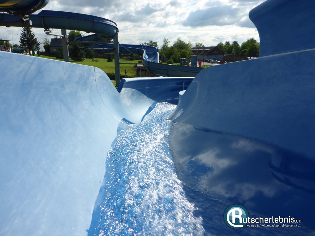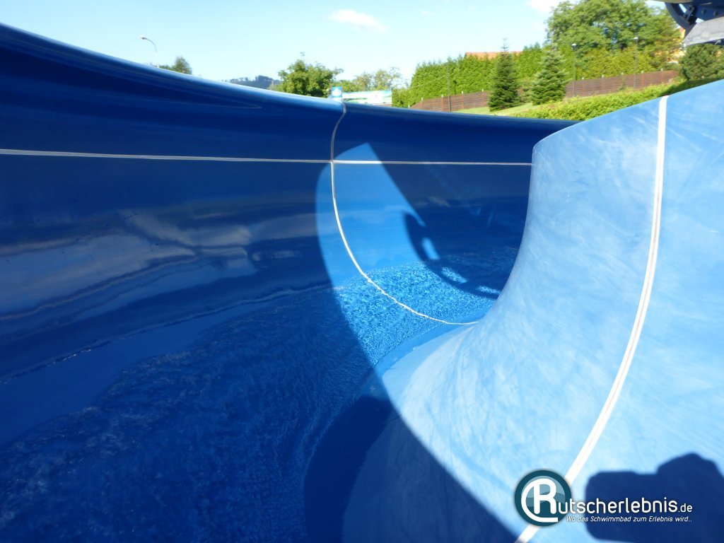Die offene Riesenrutsche rechts ist das spiegelverkehrte Pendant zur linken Rutsche. Auch hier schwingt man in den Kurven schön nach oben und landet nach 81 Metern per Sofa-Auslauf im Sicherheits-Landebecken.