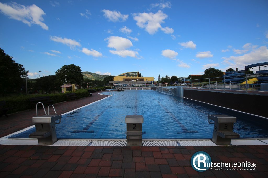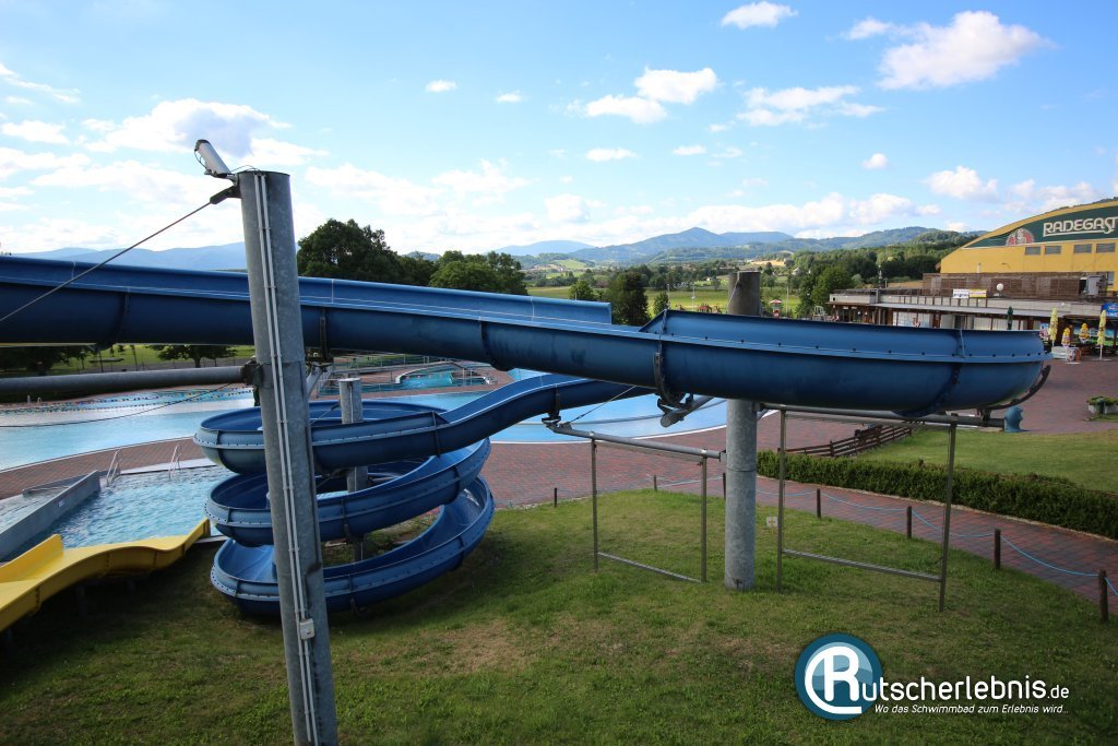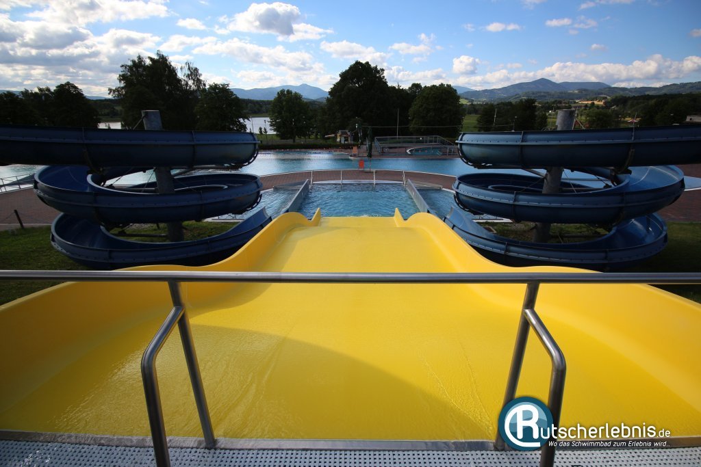 Rutschenspaß bietet die große Rutschenanlage in der Mitte des Freibades. Alle drei Riesenrutschen münden in ihr eigenes Landebecken und sind nicht mit dem Rest der Wasserlandschaft verbunden. Die Rutschen stehen am Hang, die restlichen Meter zu den Starts in bis zu acht Metern Höhe legt man über eine zweiseitige Treppe zurück. In der Mitte startet die gelbe Breitrutsche. Mit Schwung am Start schafft man es mit viel Geschick, dass man bei der zweiten Welle ein wenig von der Rutschfläche abhebt und dann förmlich ins Landebecken fliegt. Die 16 Meter lange Riesenrutsche von Aquarena ist auf jeden Fall gelungen und eine schöne Ergänzung im Freibad.