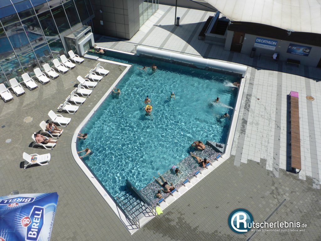 In leicht erhöhter Position hinter dem Erlebnisbecken kann man im Relaxbecken bei wohlig warmer Wassertemperatur entspannen. In der überdimensionalen Badewanne gibt es mehrere Whirlliegen, die für sanftes Geblubber sorgen.