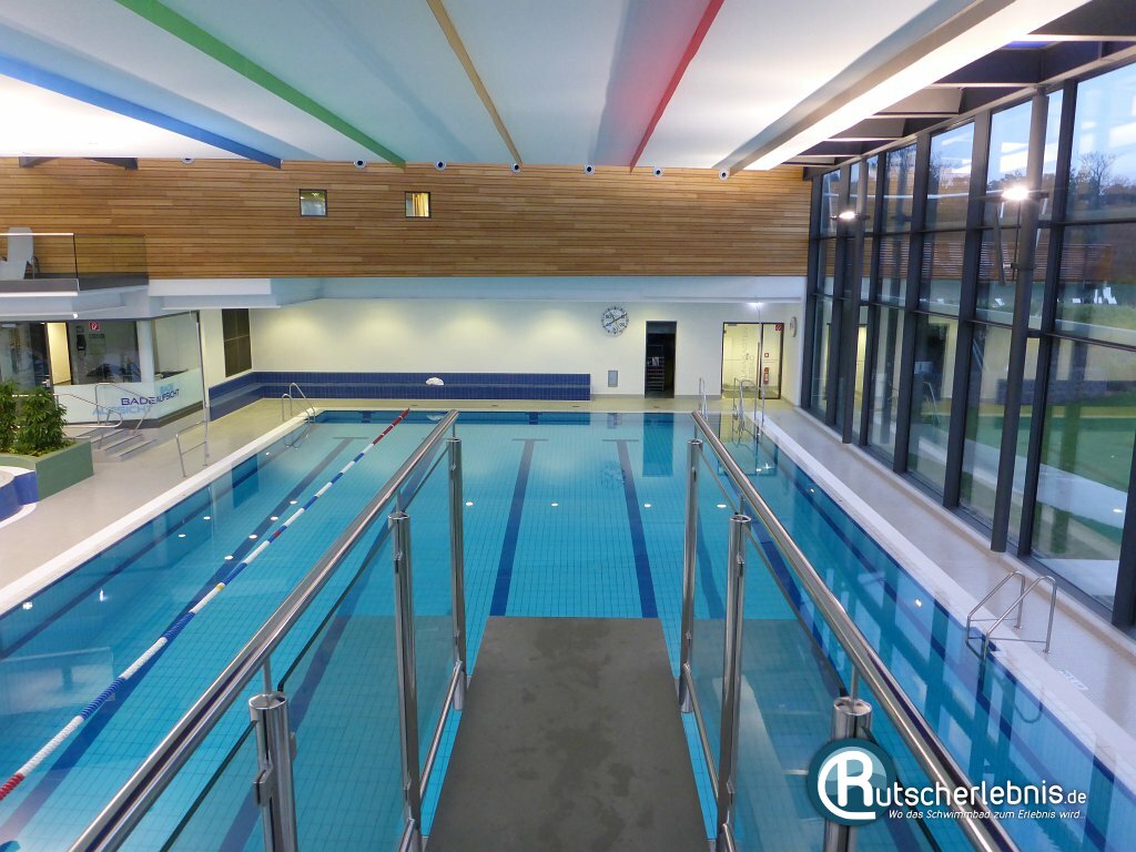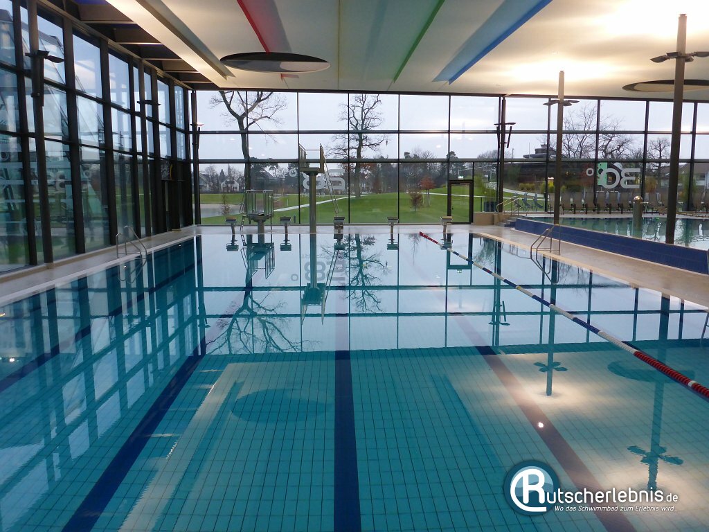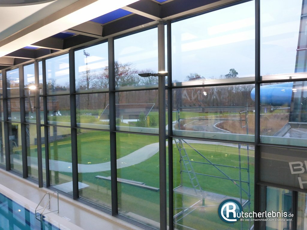 Die Schwimmhalle mit ihrem nach hinten abfallenden Dach ist von der Gestaltung her sehr offen und hell. Uns hat besonders die Nähe zur umliegenden Natur gefallen. Durch die großen Glasflächen hat man immer einen Blick auf den schönen Park, welcher im Sommer außerdem komplett als Freibad-Liegefläche dient.