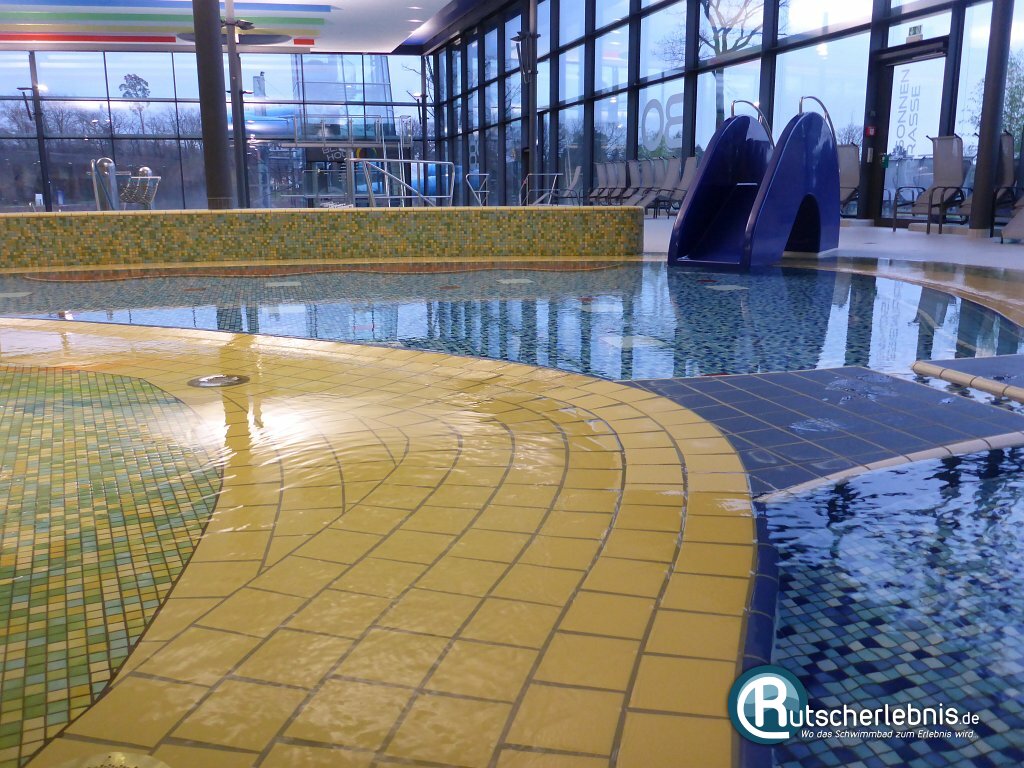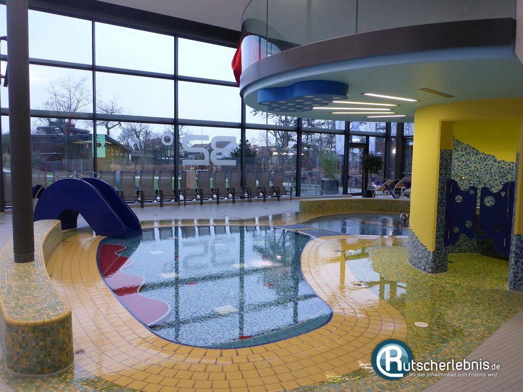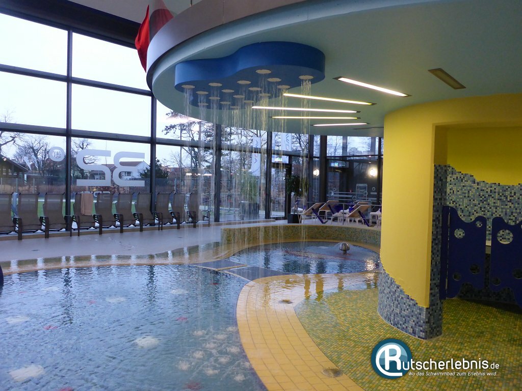 Und auch für Babys und Kinder wurde natürlich an ein Beckenangebot gedacht. Das Kinderbecken ist - sofern man es von Weitem oder von der Empore aus betrachtet - einem Fisch nachempfunden. Ein Wasser-Igel sorgt für spritziges Vergnügen und ein Regenschauer von der Decke ergießt sich zeitweise auf die kleinen Badegäste. Am Becken befindet sich direkt ein Wickelraum sowie eine Toilette. Rund um das Becken haben Eltern zudem die Möglichkeit, ihren Nachwuchs von der umlaufenden Begrenzungsmauer aus zu beaufsichtigen.
