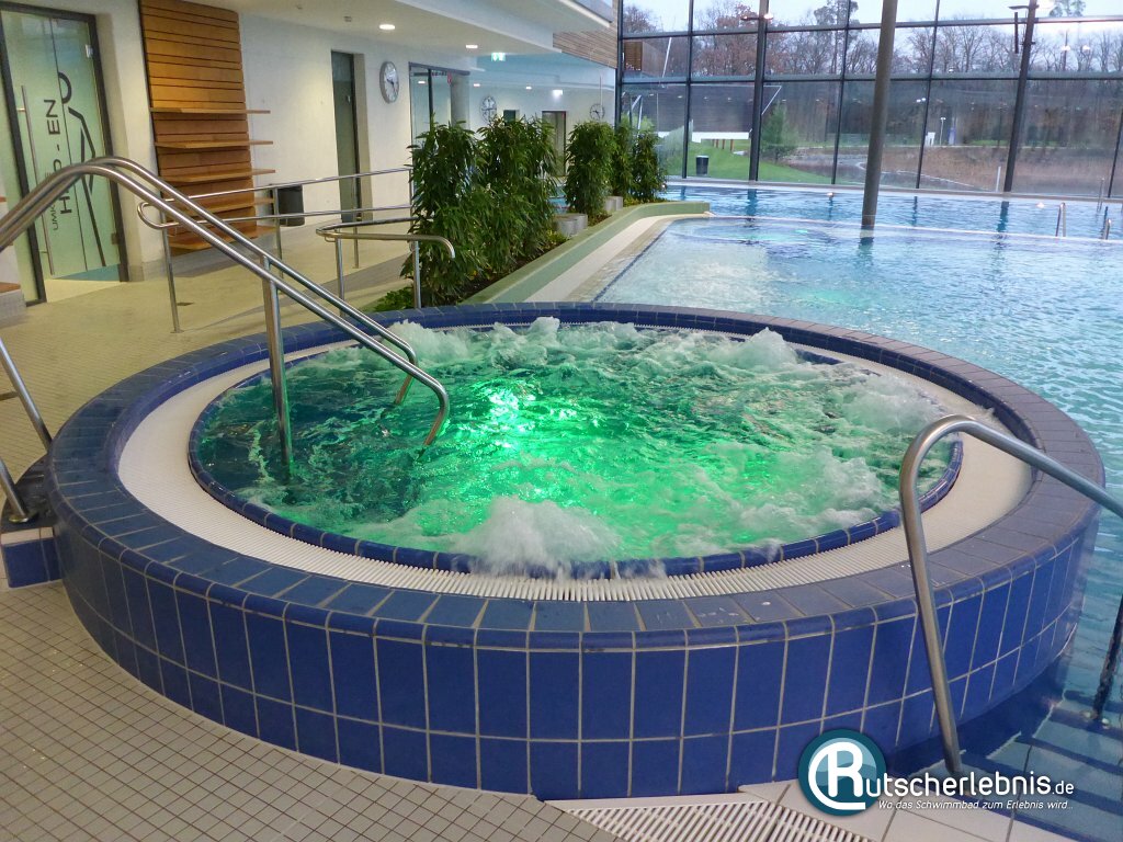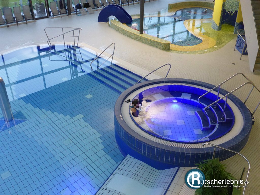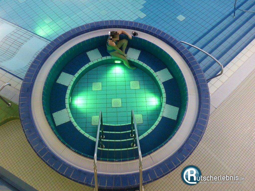 Direkt am Rand des Aktionsbeckens befindet sich ein Warmsprudelbecken. Dabei handelt es sich um einen großen Whirlpool mit sechs Massagesitzen. Der Pool selbst bietet allerdings Platz für bis zu 10 Personen.