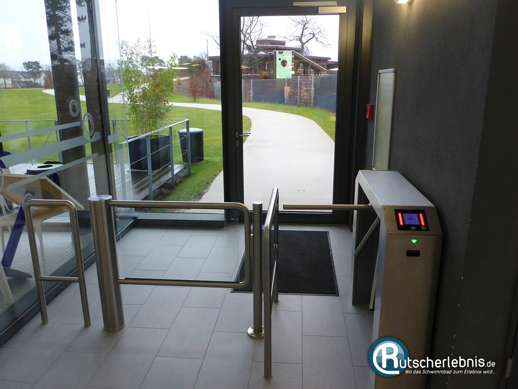 Das Gebäude und auch der Empfangsbereich des AQWA Walldorf präsentieren sich modern und mit durchdachter Architektur. Das Gebäude wurde schön in die umgebende Natur integriert und bindet diese durch große Glasflächen und die dadurch sehr helle Gestaltung ins Badeerlebnis mit ein. Der Empfang erfolgt am zentralen Kassentresen, wo man seinen Eintritt bezahlt und dann durch ein Drehkreuz ins Innere des AQWA Walldorf gelangt.