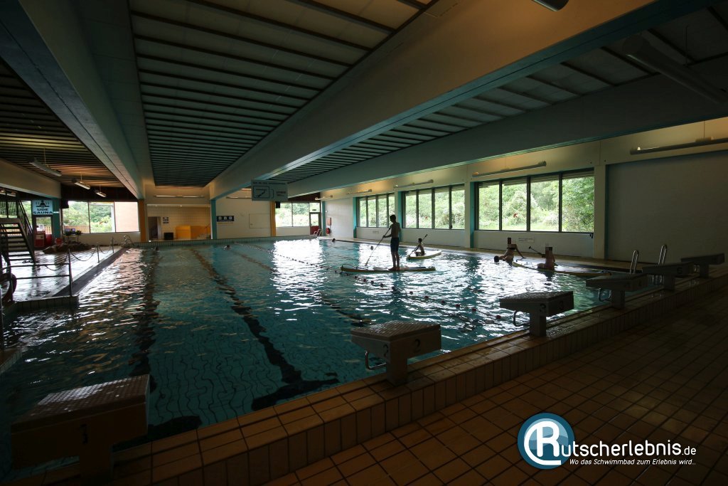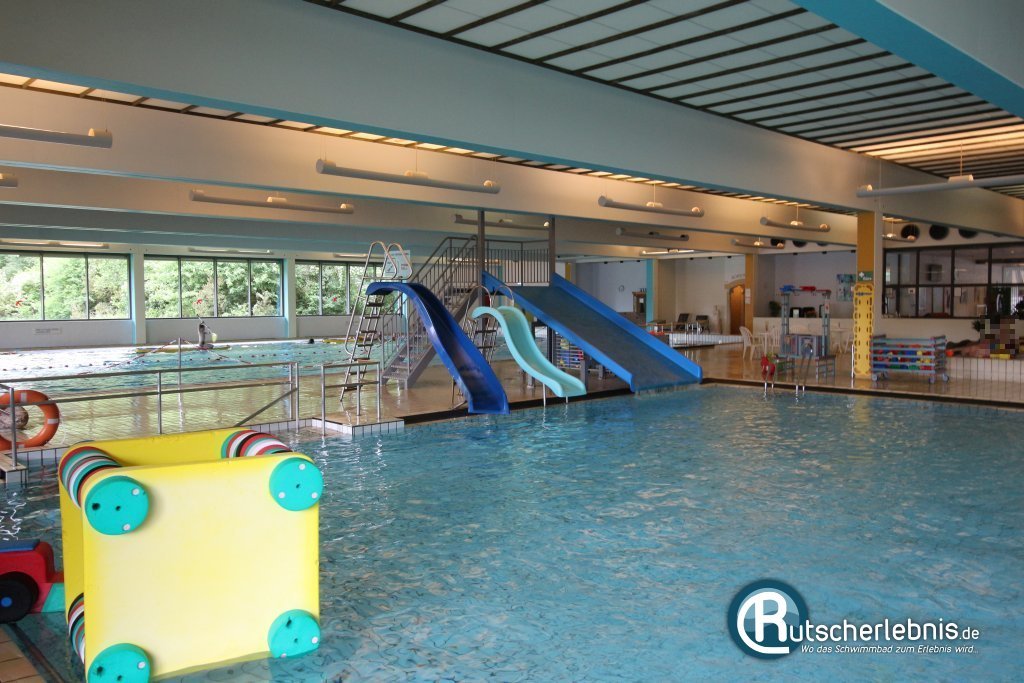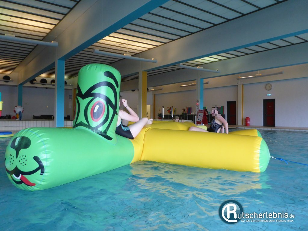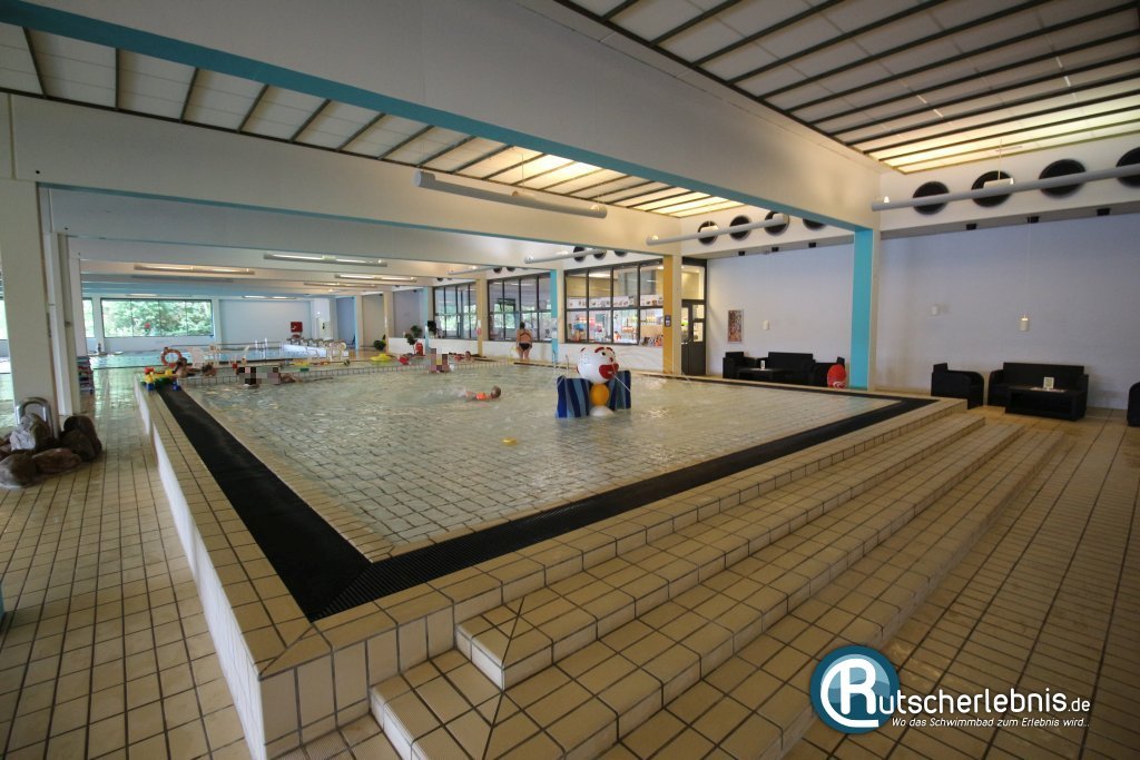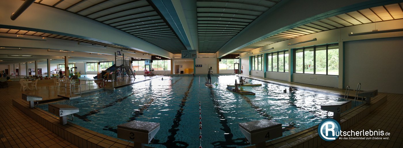 Neben den Kinderrutschen gibt es eine etwas größere und aus knapp zwei Metern Höhe startende Breitrutsche. Die recht steile Beckenrutsche führt gerade aus nach unten ins Nichtschwimmerbecken. Das Wasser ist tief genug, um eine sanfte Landung zu gewährleisten.