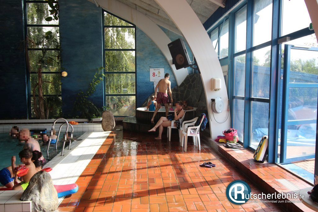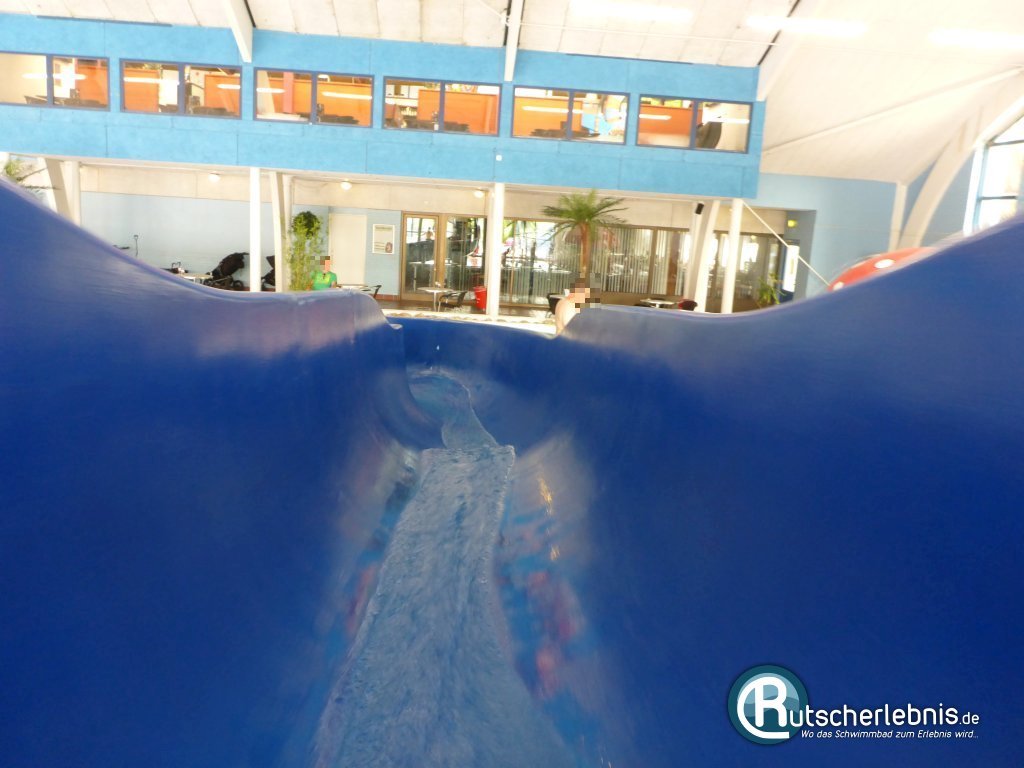 Am anderen Ende der Schwimmhalle startet eine weitere Rutsche von einem kleinen Rutschenturm. Die offene Rutsche führt an der Kopfseite des Sport- und Freizeitbeckens entlang und mündet per Plumpsauslauf im Sportbecken. Der Landebereich ist dabei mit einer schwimmenden Markierung eingegrenzt. Diesen Bereich sollte man schnell verlassen, ehe der nächste Rutscher mit Karacho aus der Rinne schießt. Die Rutsche macht trotz relativ kurzer Strecke ordentlich Spaß, lustig ist vor allem ein Drop in der Mitte und die anschließende Linkskurve ins Freizeitbecken.