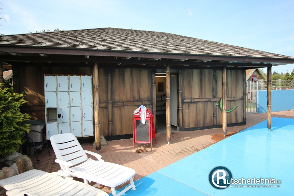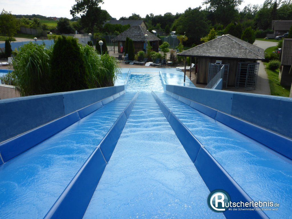 Vom Sommerbecken führt eine Beckenübergangsrutsche ins das darunter gelegene Becken. Die Rutsche ist relativ zackig und führt mit einem leichten Rechtsknick nach unten.