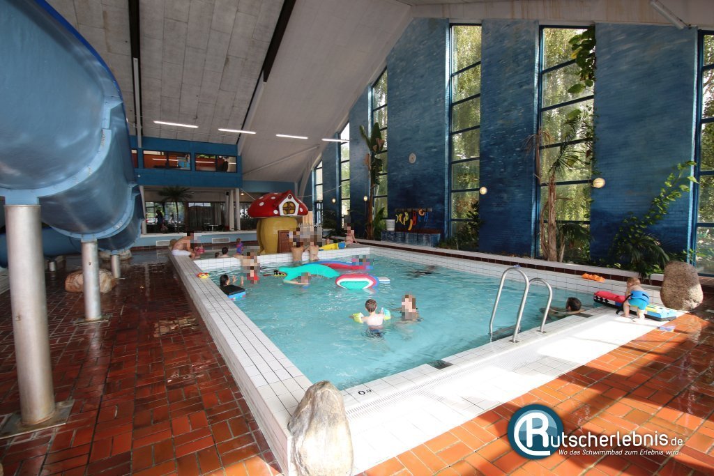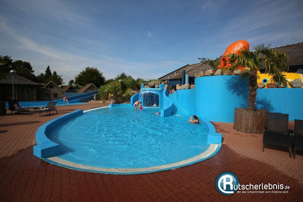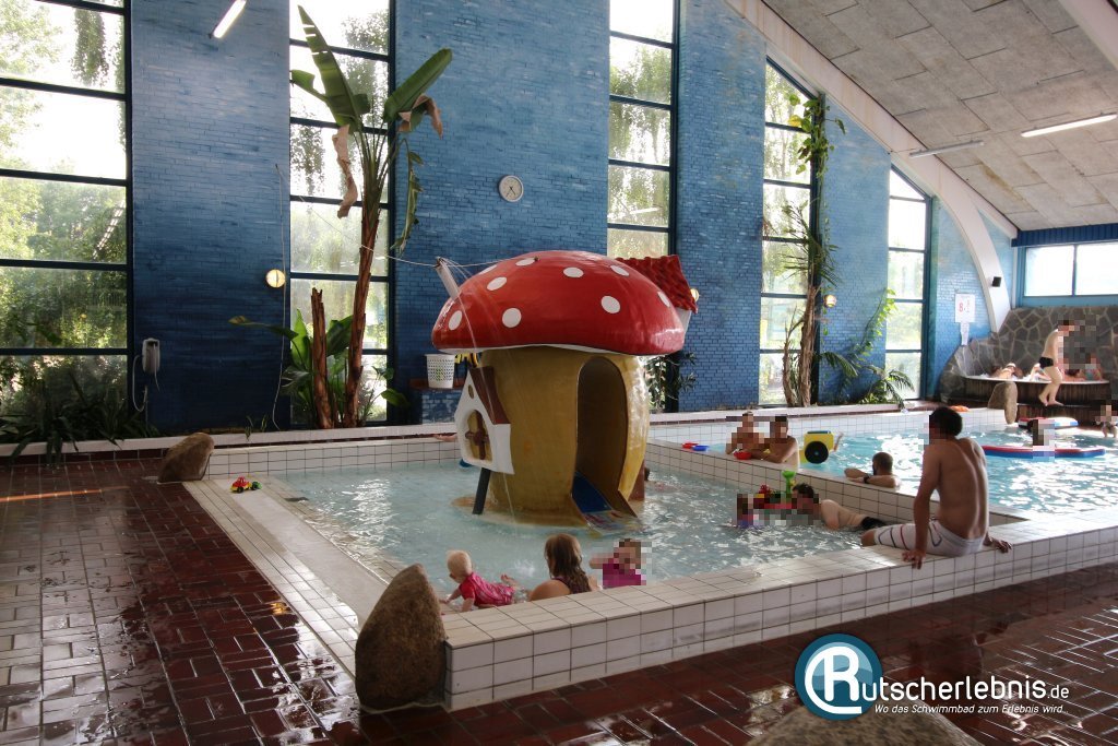 Gleich nebenan können sich die Kleinsten im Kinderbecken austoben und die Kinderrutsche im lustig gestalteten Pilzhaus nutzen.