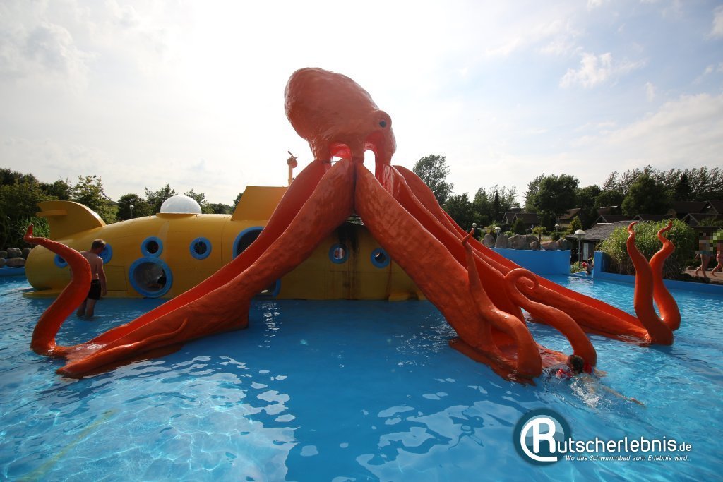 Die Krake bewacht außerdem ein begehbares U-Boot mit allerlei Schaltern und Rädchen, die zum Erkunden einladen. Aus dem Bug des Tauchbootes führt eine weitere Rutsche ins erfrischende Nass.