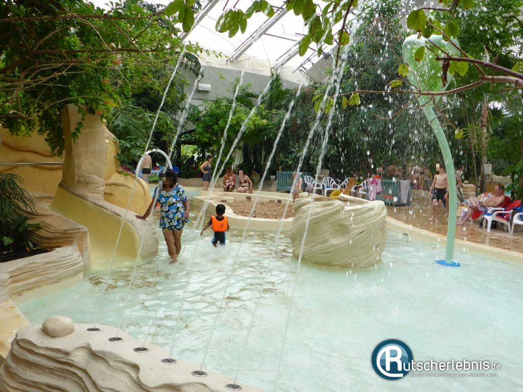 Nach einer kurzen Stärkung gehts weiter. Hier kommen wir nun am großen Kinderbereich vorbei, welcher als Lagune angelegt ist und ein ausgedehntes Planschbecken mit vielen Wasser-Figuren, zwei Kinder-Rutschen und drei bunten Kippeimern.