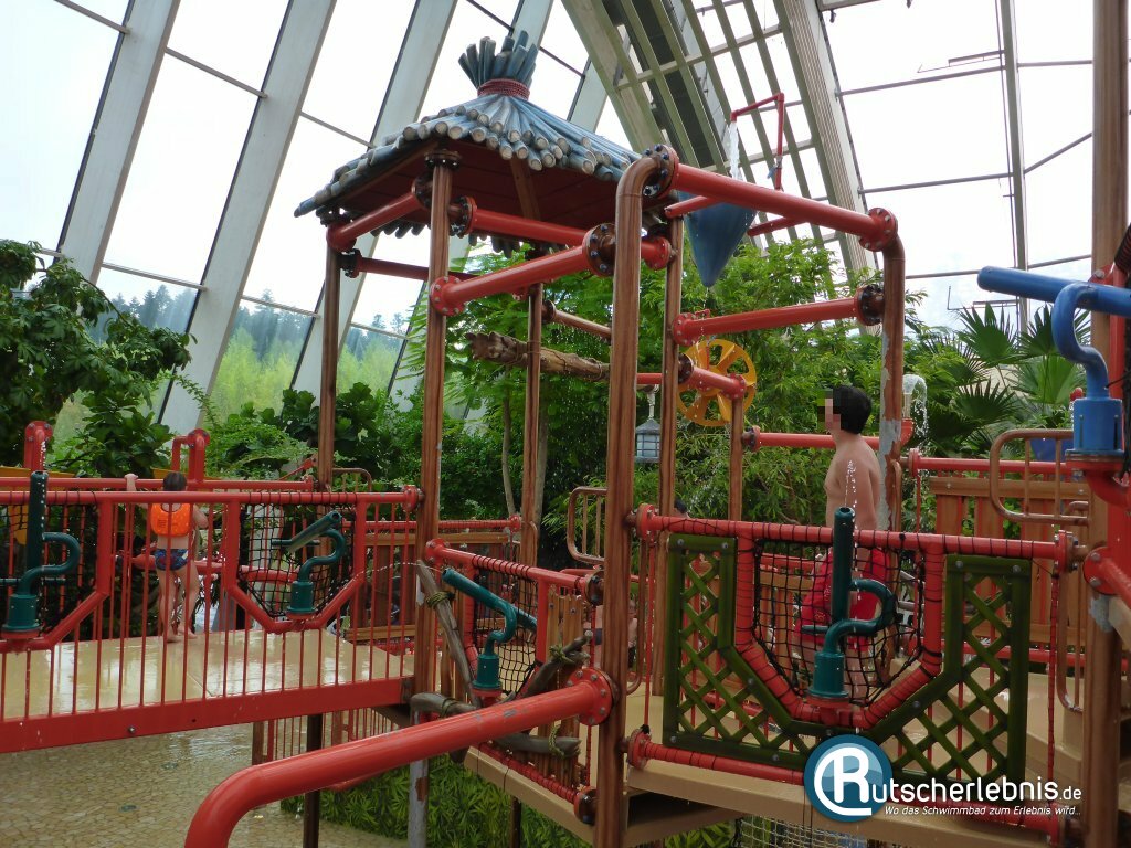 Jetzt kommen wir zur ersten, großen Attraktion. Der Center Parcs Les Trois Forêts Hattigny bietet ein großes Wasserspielhaus mit zwei Riesenrutschen und einem riesigen Kippeimer, welcher regelmäßig seinen gesamten Inhalt über ein vorlagertes Dach und anschließend auf die Besucher ergießt.