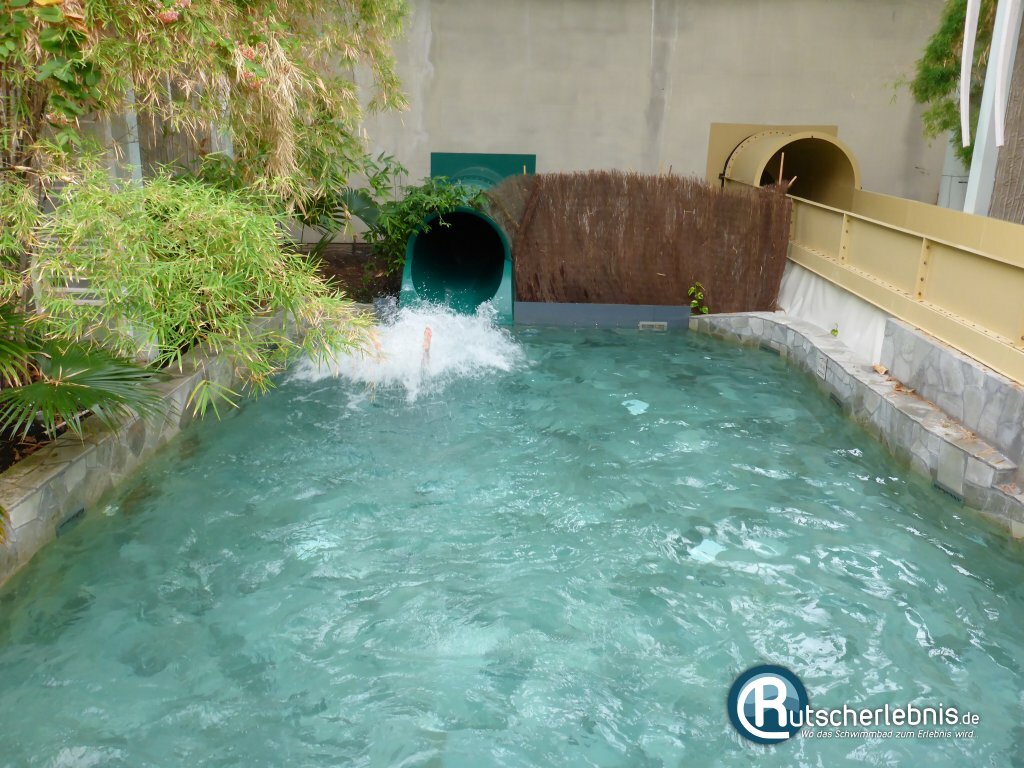 Vom Wellenbecken zweigen mehrere Kanäle ab, einer davon führt in den Außenbereich. Zuerst kommt man hier durch einen langen Kanal, welcher noch überdacht ist. Auch hier säumen Felsen die Beckenlandschaft und erwecken so einen natürlichen und lebendigen Eindruck.