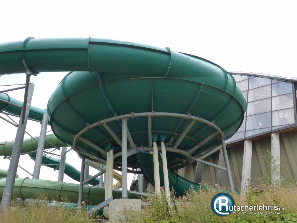Kommen wir nun langsam aber sicher mal zu den Rutschen, denn hier gibt es gleich sechs Exemplare, neben den bereits beschriebenen Rutschen im Wasserspielhaus und dem Kinderbereich. Den Anfang macht die bereits erwähnte Breitrutsche, welche von einer Anhöhe startet und dann ins Freizeitbecken mündet. Wenig spektakulär, macht aber - wie alle Breitrutschen diesen Typs - Spaß.