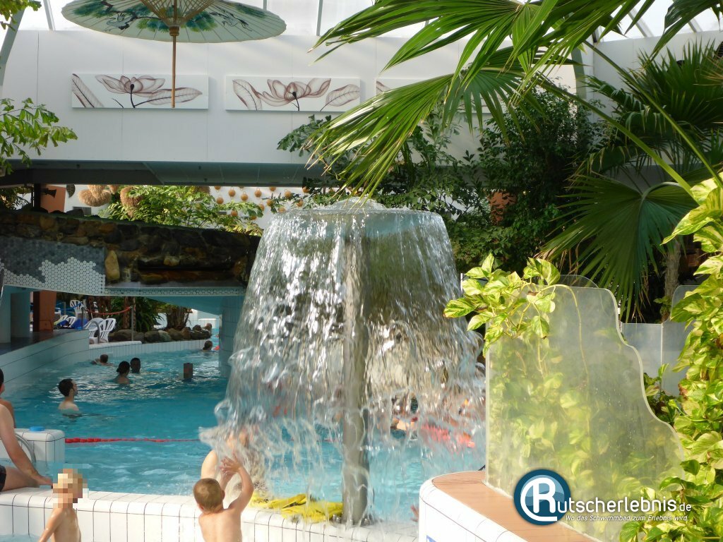 In der Hauptsache besteht das subtropische Erlebnisbad im Center Parcs Eifel Gunderath aus einem großen, zusammenhängenden Erlebnisbecken. Durch eine Treppe erreicht man das große Spaß- und Freizeitbecken, welches mittels Stoff-Leine in einen Schwimmer- und Nichtschwimmerbereich eingeteilt ist. An der Becken-Innenseite ist ein schöner Wasserfall in eine Steinfassade integriert, sieht wirklich nett aus. Ein weiterer Wasserfall stürzt sich von einer Brücke hinab ins Erlebnisbecken. Neben diesen optischen Gimmicks bietet das große Erlebnisbecken außerdem mehrere Whirl- und Massageliegen, einen Wasserpilz und Wasser-Geysire.