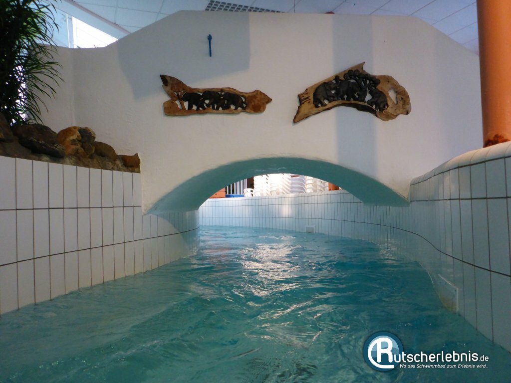 Jenseits der Nichtschwimmer-Abtrennung beginnt der große Strömungskanal, welcher einen auch direkt zum zweiten Teil des Erlebnisbeckens bringt. Trotz seiner Größe und Länge ist der Strömungskanal schön flott und kann sogar auf bereitgestellten Reifen oder Schwimm-Zigarren beritten werden. Letztes sind längliche Schwimmhilfen mit glatter Gummioberfläche, auf welche man sich drauflegen oder mit ganz viel Geschick sogar draufsetzen kann.