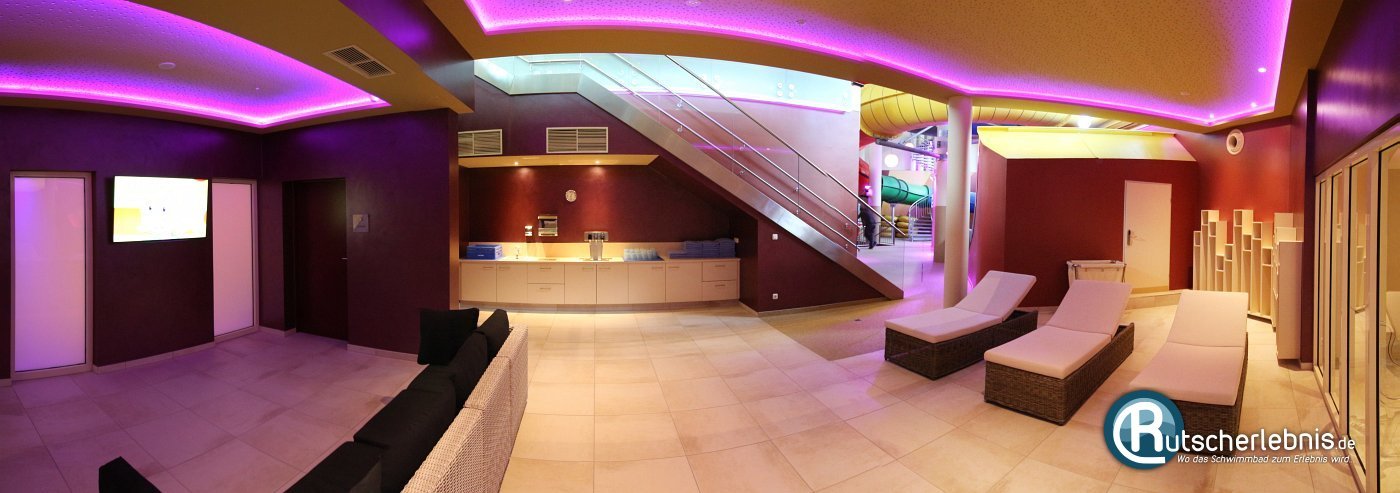 Die Erlebniswelt befindet sich in der Schwimmhalle nebenan. Wenn man das Badeparadies von unten betritt (dort, wo sich auch die Familien-Sauna befindet), landet man zuerst im Aufenthaltsbereich mit Getränkespendern, großer Sitznische und Kinderkino. Die Getränkespender können kostenfrei genutzt werden.