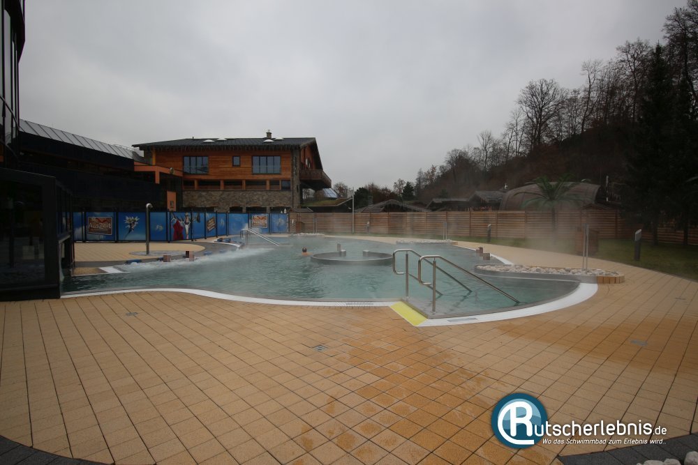Von der Piratenbucht führt ein langer überdachter Durchschwimmkanal nach draußen ins ganzjährig nutzbare Außenbecken. Hier ist vom Trubel im Innenbereich wenig zu spüren und man kann ein wenig die frische Luft genießen. Seitlich stürzt sich ein breiter Wasserfall ins Becken, auf Sprudelliegen kann man es sich gut gehen lassen und in einer Whirlbucht sorgen mehrere Geysire für sprudeliges Whirlvergnügen.