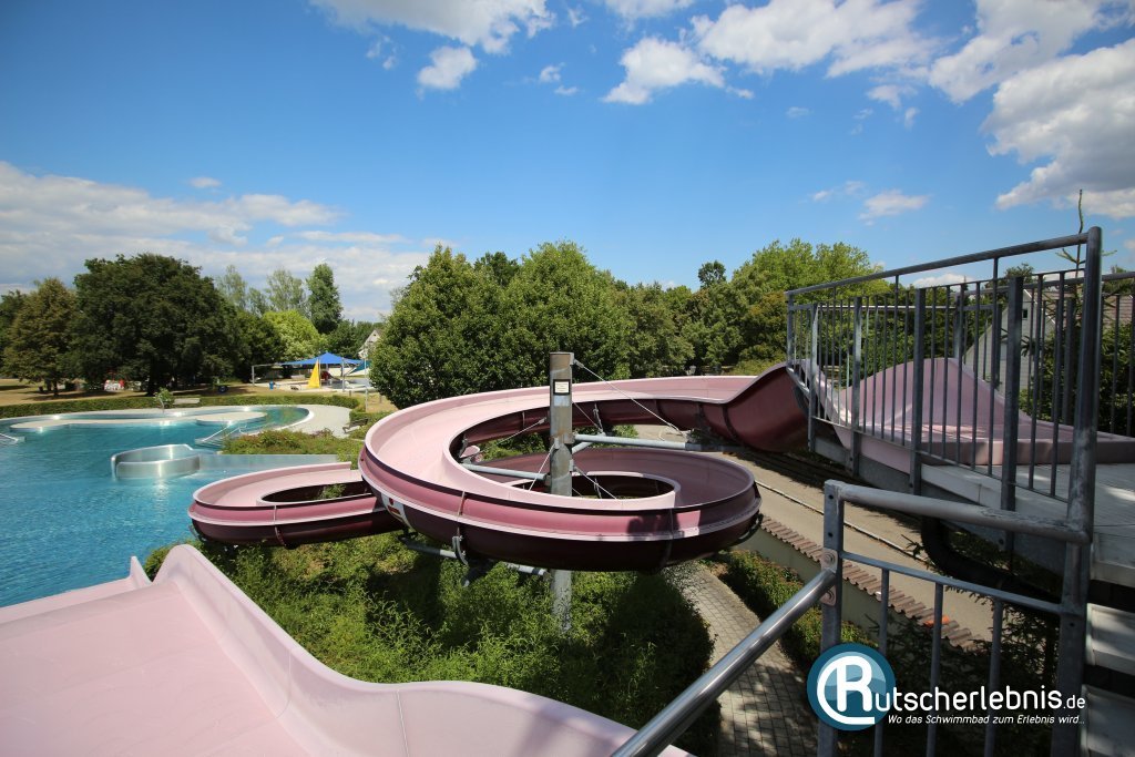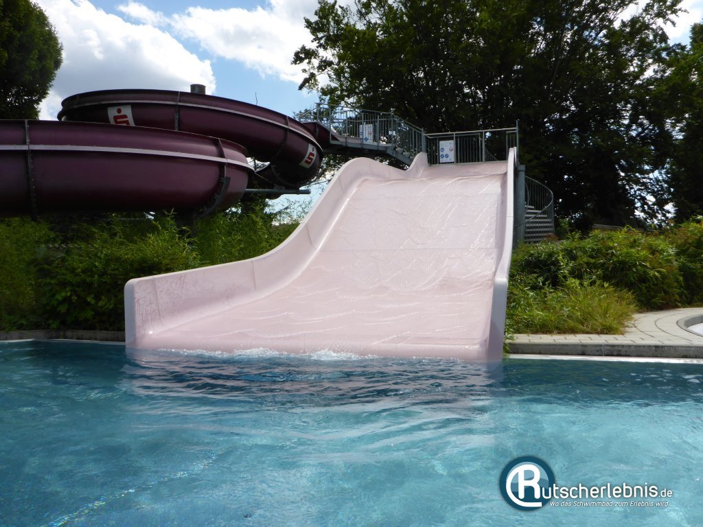 Highlight und unser Besuchsgrund ist die Rutschenanlage am Erlebnisbecken, bestehend aus einer Breitrutsche und einer Freirutsche. Beide Rutschen fallen durch die ungewöhnliche Farbe auf, denn die Spaßgeräte sind rosa!