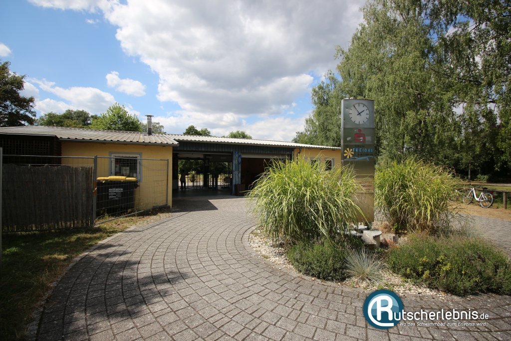 Der Vorplatz und der Eingangsbereich zum Freibad Schrobenhausen an der Schleifmühle sind schön gestaltet. Eine große Säule mit Uhr, Sponsoren-Tafel und Logo zeigt uns, dass wir richtig sind. Der überdachte Eingang beherbergt ein Kassenhäuschen, eine Drehkreuzanlage und einen Kassenautomaten. Da die Kasse nicht ständig besetzt ist muss man vor allem an weniger frequentierten Tagen mit dem Automaten vorlieb nehmen. Nach dem Füttern mit Kleingeld gibt es eine Eintrittskarte, mit der man durch das Drehkreuz zum Badbereichg elangt.
