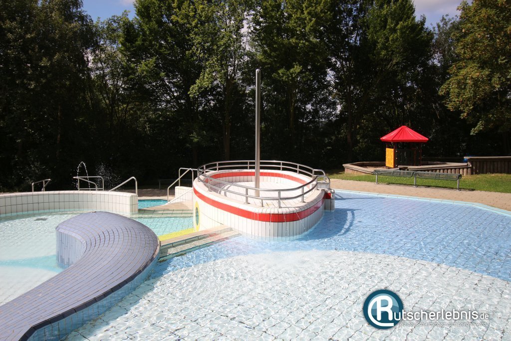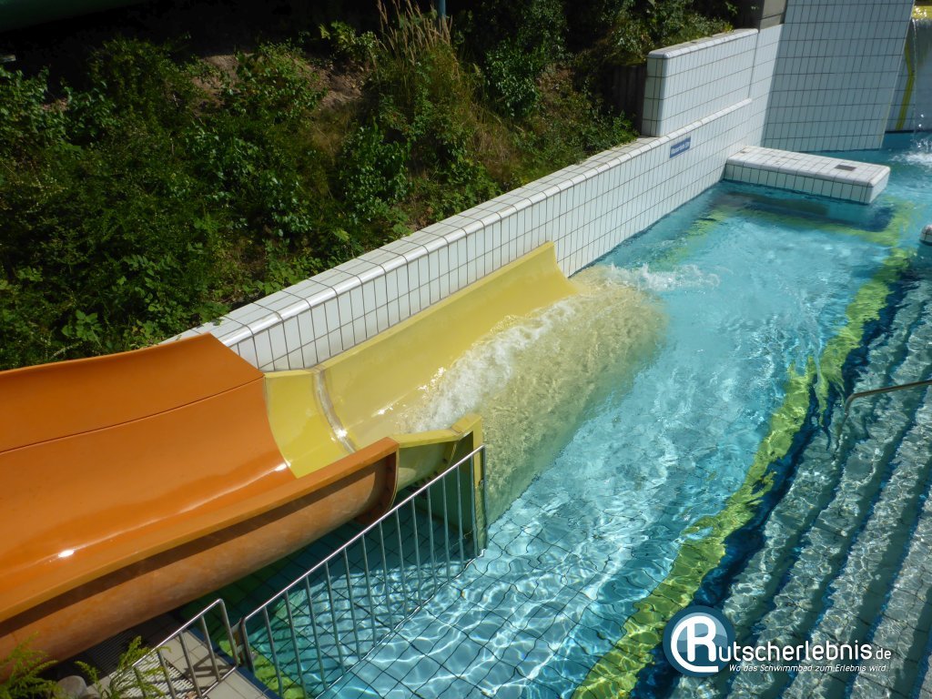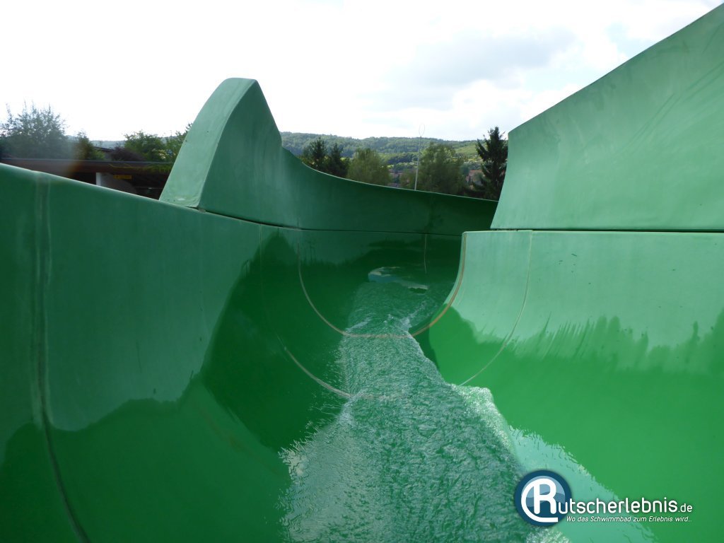 Die offene Riesenrutsche ist zu zwei Dritteln hangverlegt und startet aus etwa sieben Metern Höhe. Die Freibadrutsche ist anfangs eher gemütlich, mit Schwung am Start schaukelt man jedoch schön hin und her, was vor allem in der S-Kurve vor der finalen Spirale richtig Spaß macht. Am Ende geht es per Sofaauslauf ins Spaßbecken. Dort endet die Rutschpartie nach 65 Metern.