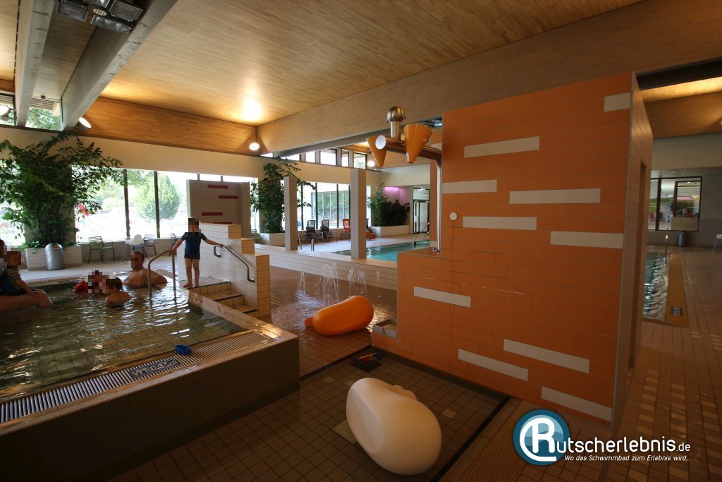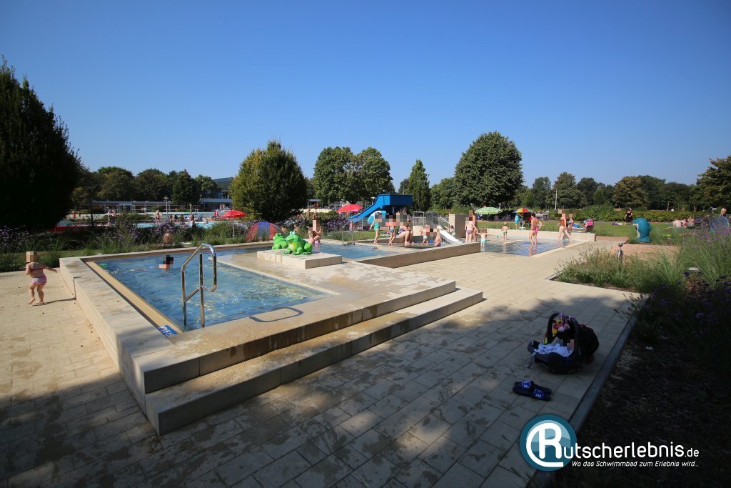 Hinter dem Warmbecken können die Kids im Kleinkindbecken planschen. Für Unterhaltung und Abwechslung sorgen dabei verschiedene Wasserspielzeuge, ein Wasserfall und ein Wasserlauf. Eine Kinderrutsche gibt es leider nicht, vielleicht wird hier ja noch nachgerüstet - Platz wäre auf jeden Fall noch vorhanden.