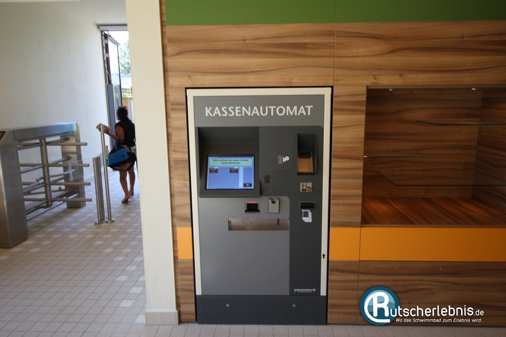 Der Eingangsbereich erstrahlt hell und freundlich, große Glasflächen und hochwertige moderne Materialien sorgen für ein angenehmes Ambiente. Am länglichen Kassentresen wird man freundlich begrüßt und kann nach dem bezahlen durch ein Drehkreuz voran schreiten.
