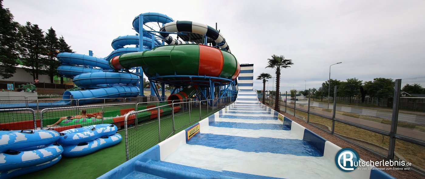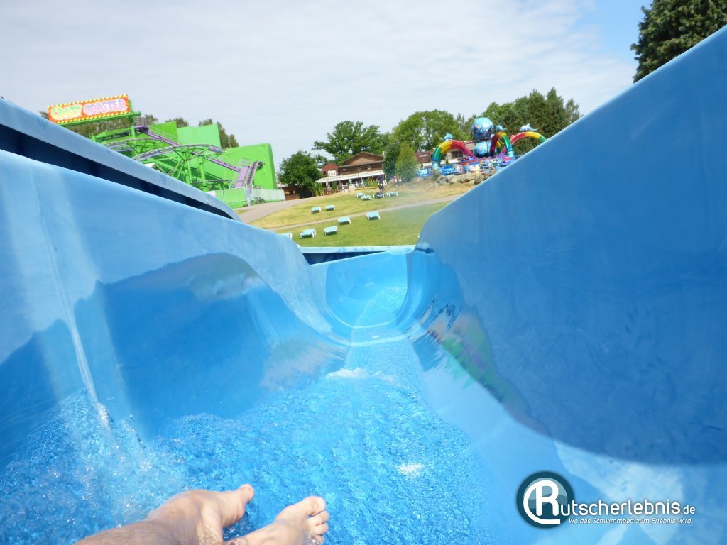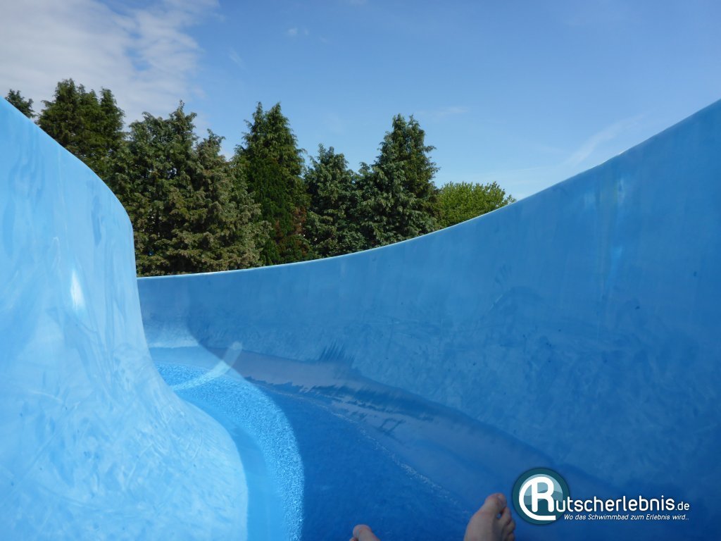 Ein kleiner Rutschenturm mit zwei parallel verlaufenden, offenen Riesenrutschen steht direkt hinter dem Wasserspielhaus. Beide Bahnen sind ungefähr gleichlang und eignen sich so für Wettrutschen. Zuerst geht es links durch eine eher gemütliche 180°-Kurve. Anschließend folgt ein kleiner Jump, der einen auf Speed bringt. Nun geht es durch eine zackige Linkskurve, gefolgt von einer Rechtskurve. Nach dieser Passage kommt ein weiterer Jump, der einen direkt in die finale und durchaus scharfe Rechtskurve befördert. Nach einer ganz kurzen Gerade geht es mit ordentlich Geschwindigkeit per Plumpsauslauf ins Landebecken.