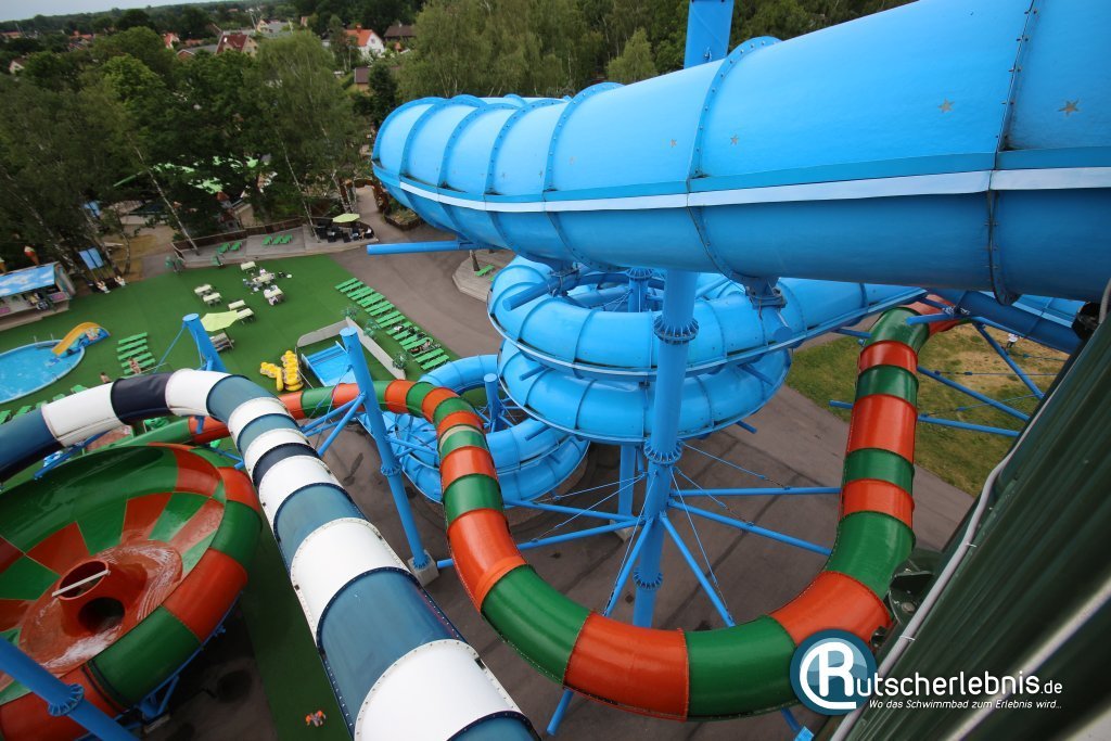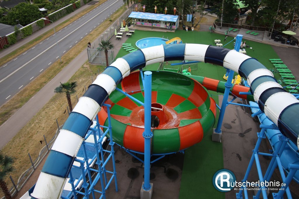 Die beiden anderen Rutschen starten ein Stockwerk unterhalb der blauen Reifenrutsche. Rechts startet die Reifen-Trichterrutsche “Tornado”. Die blau-orangene Riesenrutsche startet mit einer langen und immer steiler werdenden Anlaufröhre. Am Ende geht es mit einem ordentlichen Linksknick in den Trichter.