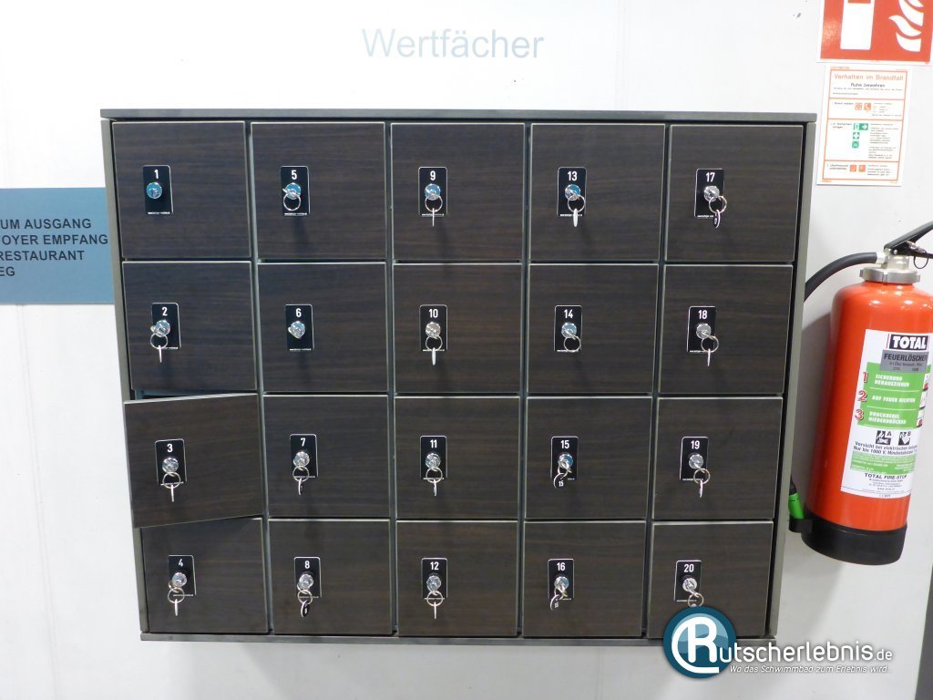 Der gesamte Umkleidebereich wirkt sehr edel und modern. Geschwungene Linien an den blauen Umkleidekabinen vermitteln einen dynamischen Eindruck. Passend dazu werden die Umkleiden von zahlreichen Deckenspots beleuchtet. Der Boden ist dreifarbig diagonal gefliest, die unterschiedlichen Plattengrößen passen perfekt zum insgesamt stimmigen Gesamtbild. Die Umkleidekabinen bieten jede Menge Platz, um sich gemütlich umzuziehen. Kleiderspinde sind zahlreich vorhanden, diese werden mit Hilfe des Chiparmbandes elektronisch verriegelt, Pfand wird so nicht benötigt.