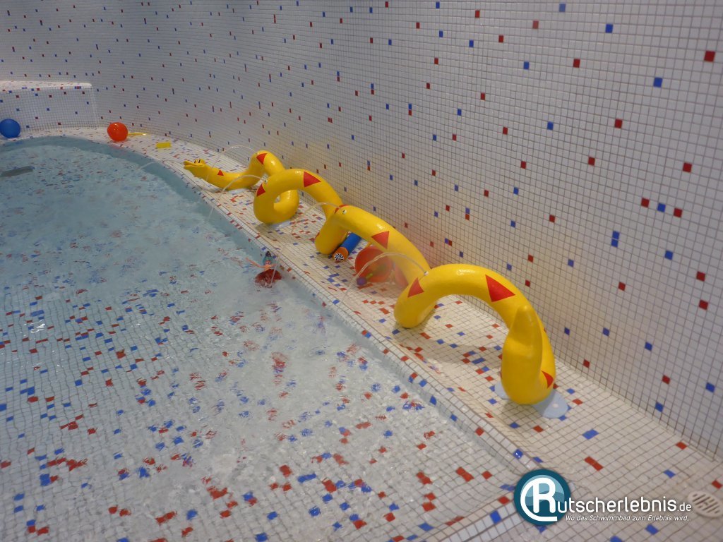 Zum Abschluss werfen wir noch einen Blick auf das in einer Nische untergebrachte Kinderbecken, welches bei den kleinen Badegästen für Erheiterung sorgt. Mit einer Regenbogen-Rutsche und einer wasserspeienden Schlange ist für spritzigen Wasserspaß gesorgt. Die Beleuchtung ist dank zahlreicher Spots angenehm hell. Eltern finden auf einem Podest direkt im Wasser Platz, um ihren Nachwuchs direkt am Becken zu beaufsichtigen. So können auch Kids am Badebetrieb im StuBay Freizeitcenter Telfes teilhaben. Das Kinderbecken komplettiert die insgesamt gelungene Wasserlandschaft und wir verabschieden uns - bis zum nächsten Mal!