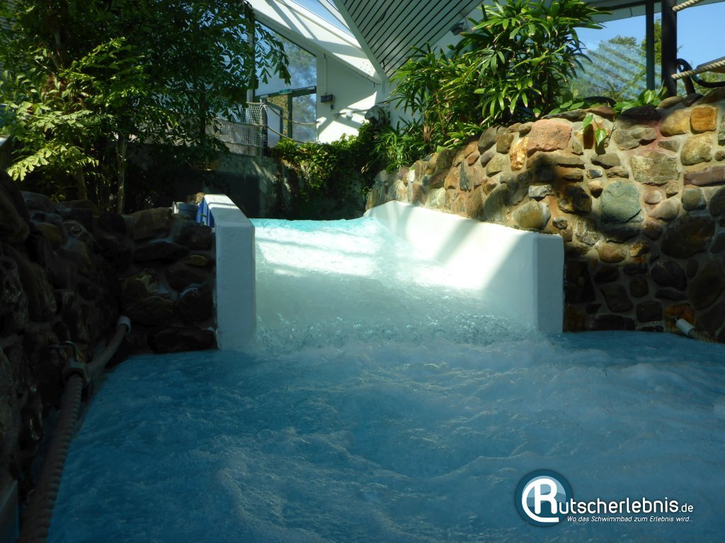 Das Becken dient gleichzeitig als Startpunkt für die Wildwasserrutsche, die komplett im Außenbereich verläuft. Schnelle Rutschpassagen wechseln sich mit ruhigen Lazy-River-Abschnitten ab. Nach einem eher gemütlichen Anfang mit zwei Stromschnellen und langen Zwischengeraden mit kaum Strömung geht es unter einer Brücke hindurch und anschließend steil nach unten in ein Zwischenbecken. Ab da geht es rasant weiter und durch transparente Lamellen in die Schwimmhalle.
