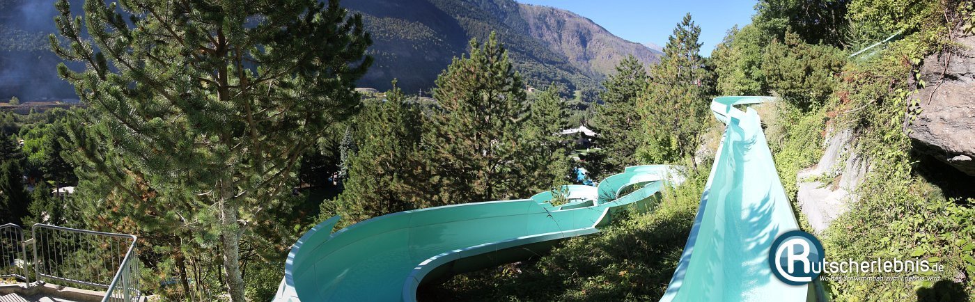 Rutschenfans kommen im Thermalbad Brigerbad ebenfalls nicht zu kurz und können sich auf die längste Outdoor-Wasserrutsche in den Alpen freuen. Die offene Riesenrutsche ist bereits von Weitem sichtbar. Das Spaßgerät ist direkt am Hang bzw. am Berg verlegt und startet aus beachtlichen 23,30 Metern Höhe. Der Weg nach oben ist dabei nichts für Treppen-Muffel. Zuerst geht es durch einen Stollen und anschließend über unzählige Treppen nach oben. Fast ganz oben befindet sich sogar eine Aussichtsplattform auf einem Felsvorsprung, welche einen genialen Blick ins Tal, auf die Rutsche und auf das Thermalbad erlaubt.