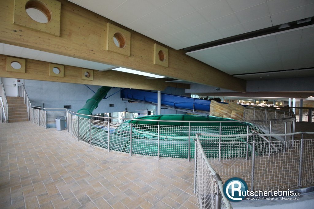 In der selben Halle ist das über zwei Meter tiefe Landebecken der grünen Trichterrutsche untergebracht. Der Rutschenaufgang befindet sich nur ein paar Meter entfernt. Oben angekommen geht es mit dem Grünsignal durch eine massive Drehkreuz-Anlage zum Startbereich der grünen Riesenrutsche. Wer sich beim Anblick der steilen Röhre fürchtet, hat nur die Möglichkeit, per Notknopf einen Bademeister zu rufen, um aus dem Startbereich wieder zurückzugelangen.