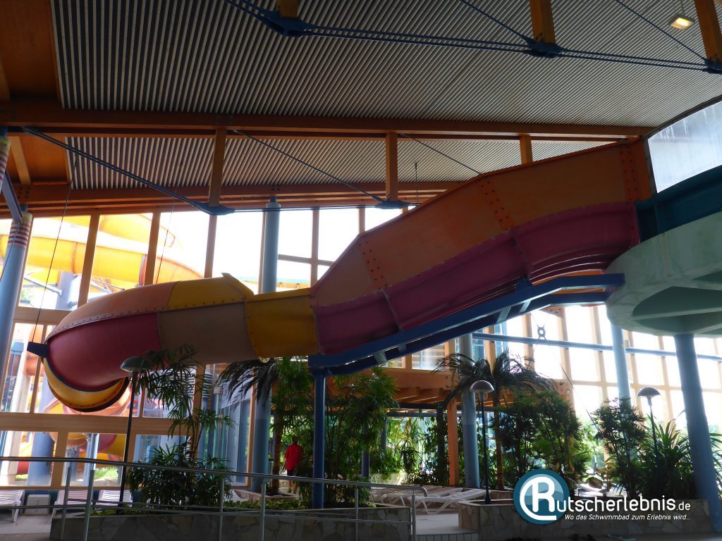 Und ein allerletztes mal heißt es Treppen laufen und ab nach oben und zum Abschluss ist nochmal ein Reifen unterm Arm eingeklemmt. Denn neben der Crazy River Reifenrutsche wartet weiter oben im Turm die Rafting Slide auf uns. Hierbei handelt es sich um eine Reifenrutsche, welche sich 105 Meter lang den Rutschenturm hinab schlängelt. Nix besonderes aber auf jeden Fall einen Rutsch wert, macht auf jeden Fall Spaß und man schaukelt in den Kurven auch leicht nach oben. Wenn man nicht aufpasst, kann man sich sogar drehen.