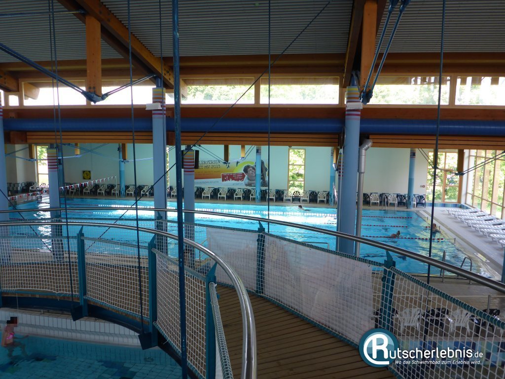 Die Schwimm- und Erlebnisbad-Halle ist übersichtlich aufgeteilt. Ganz links ist das Sportbecken mit seinen fünf Bahnen à 25 Metern Länge. Rings um das Becken sind jede Menge Sitz- und Liegemöglichkeiten aufgestellt, sodass es definitiv nicht an Platz mangelt. Einen Sprungturm oder ein Sprungbrett gibt es allerdings nicht, lediglich Startblöcke für die Schwimmbahnen sind vorhanden.