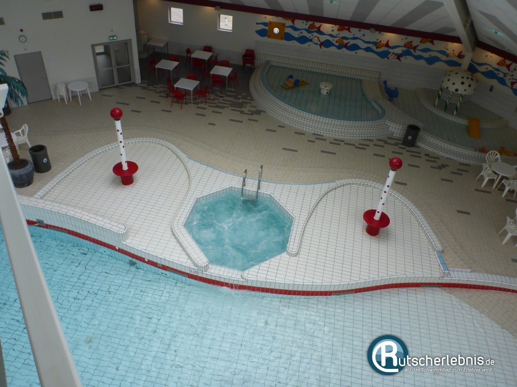 Schließlich gibt es noch ein Spaßbecken mit Wasserpilz und Wasserkanone mit durchgängig nichtschwimmertauglicher Wassertiefe.