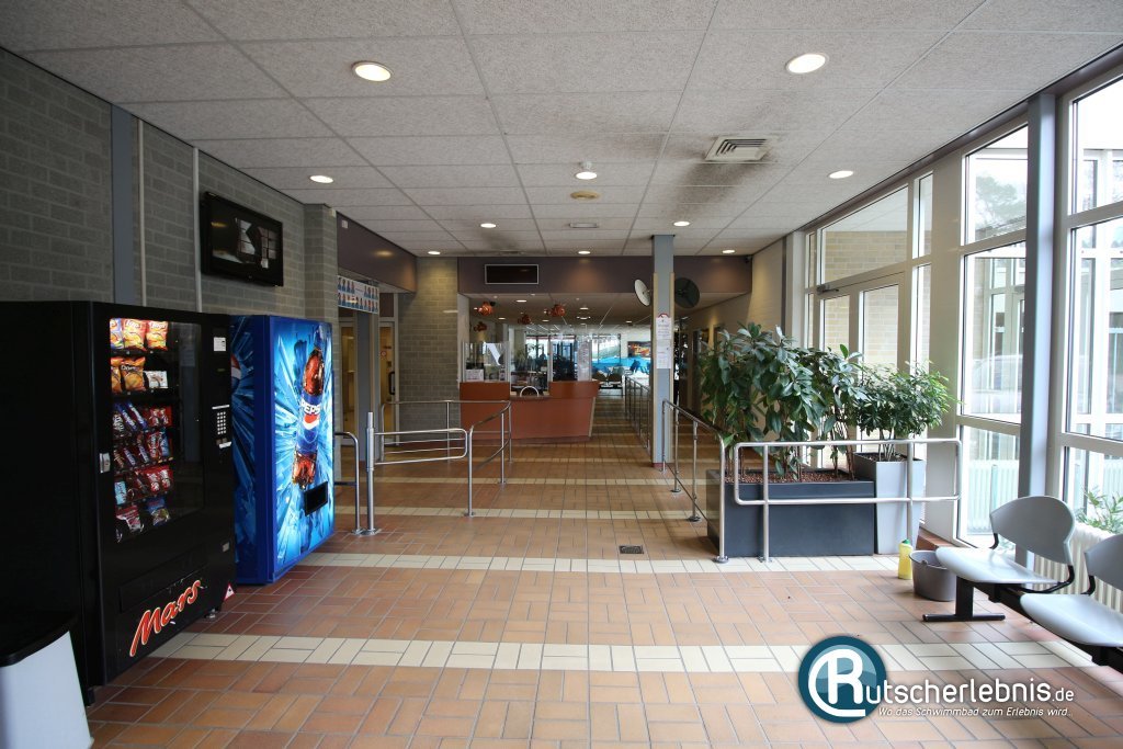 Der Eingangsbereich des Erlebnisbades Ijzeren Man ist klar strukturiert. Ganz vorne gibt es ein paar fest montierte Stühle, die an Sitzgelegenheiten im Bahnhof erinnern. Gegenüber kann man sich an einem Getränke- und einem Snackautomaten bedienen. Der Weg geradeaus führt direkt zur Kasse, wo man vom freundlichen und auch teilweise deutsch sprechenden Personal in Empfang genommen wird. Nach dem Bezahlen geht es weiter zum Umkleidebereich, eine Drehkreuzanlage gibt es nicht. Da es keine zeitliche Staffelung gibt ist das auch nicht notwendig.